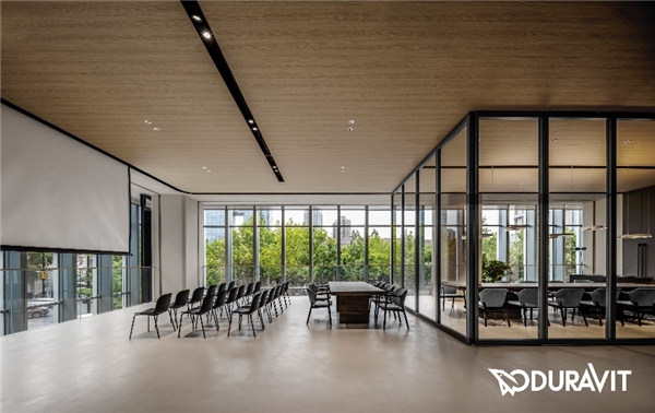 入觀內(nèi)室,這座Duravit的“上海舞臺(tái)”兩層空間主要由“臺(tái)前”和“幕后”兩個(gè)部分組成。旗艦店一樓主要由中心展示區(qū)及15個(gè)產(chǎn)品展示套間組成,對(duì)外直觀呈現(xiàn)Duravit的品牌價(jià)值和美學(xué)產(chǎn)品,共同敘寫(xiě)Duravit的臺(tái)前故事。