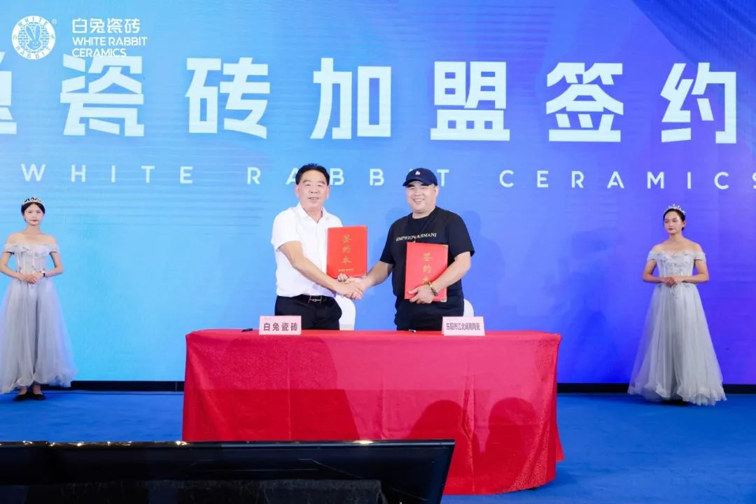 一次次真誠的握手,一份份合作協議的簽訂,為白兔瓷磚又增添了新的力量。會上,在全場來賓的共同見證下,旭日集團董事長黃英明與優秀合作伙伴代表進行合作簽約,標志著雙方將攜手共進,合作互贏,共創未來!