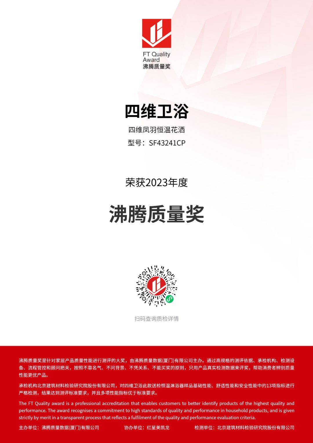 在2023沸騰質量獎測評中,四維衛浴參評的四維鳳羽恒溫花灑SF43241CP,經過承檢機構北京建筑材料檢驗研究院股份有限公司,對四維衛浴此款送檢恒溫淋浴器樣品基礎性能、舒適性能和安全性能中的13項指標進行嚴格檢測,結果達到測評標準要求,并且多項性能指標優于標準要求,獲得“沸騰質量獎”。