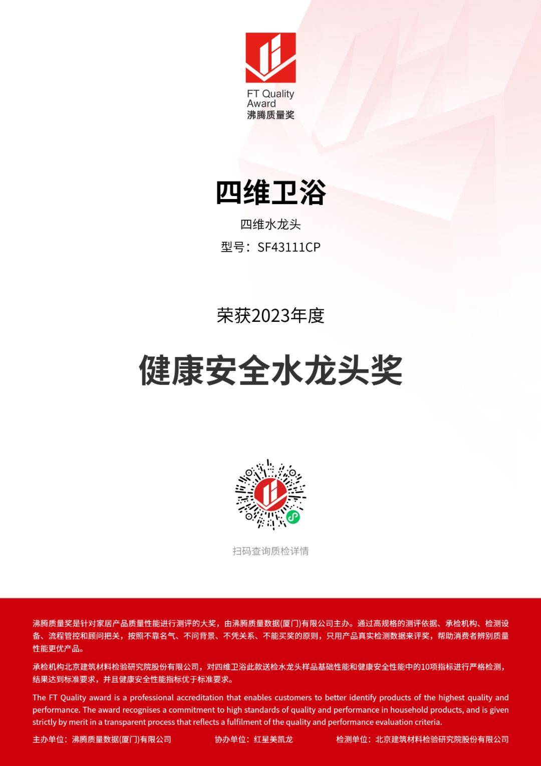 四維衛浴參評的五金龍頭SF43111CP,經過承檢機構北京建筑材料檢驗研究院股份有限公司,對四維衛浴此款送檢水龍頭樣品基礎性能和健康安全性能中的10項指標進行嚴格檢測,結果達到標準要求,并且健康安全性能指標優于標準要求,獲得“健康安全水龍頭獎”。