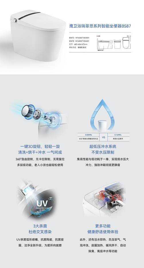 為了帶來美好的舒適體驗,設計師廖奕權特別挑選了鷹衛浴瑞菲思系列智能坐便器BS87,優雅機身、功能強大、使用便捷、潔凈升級。