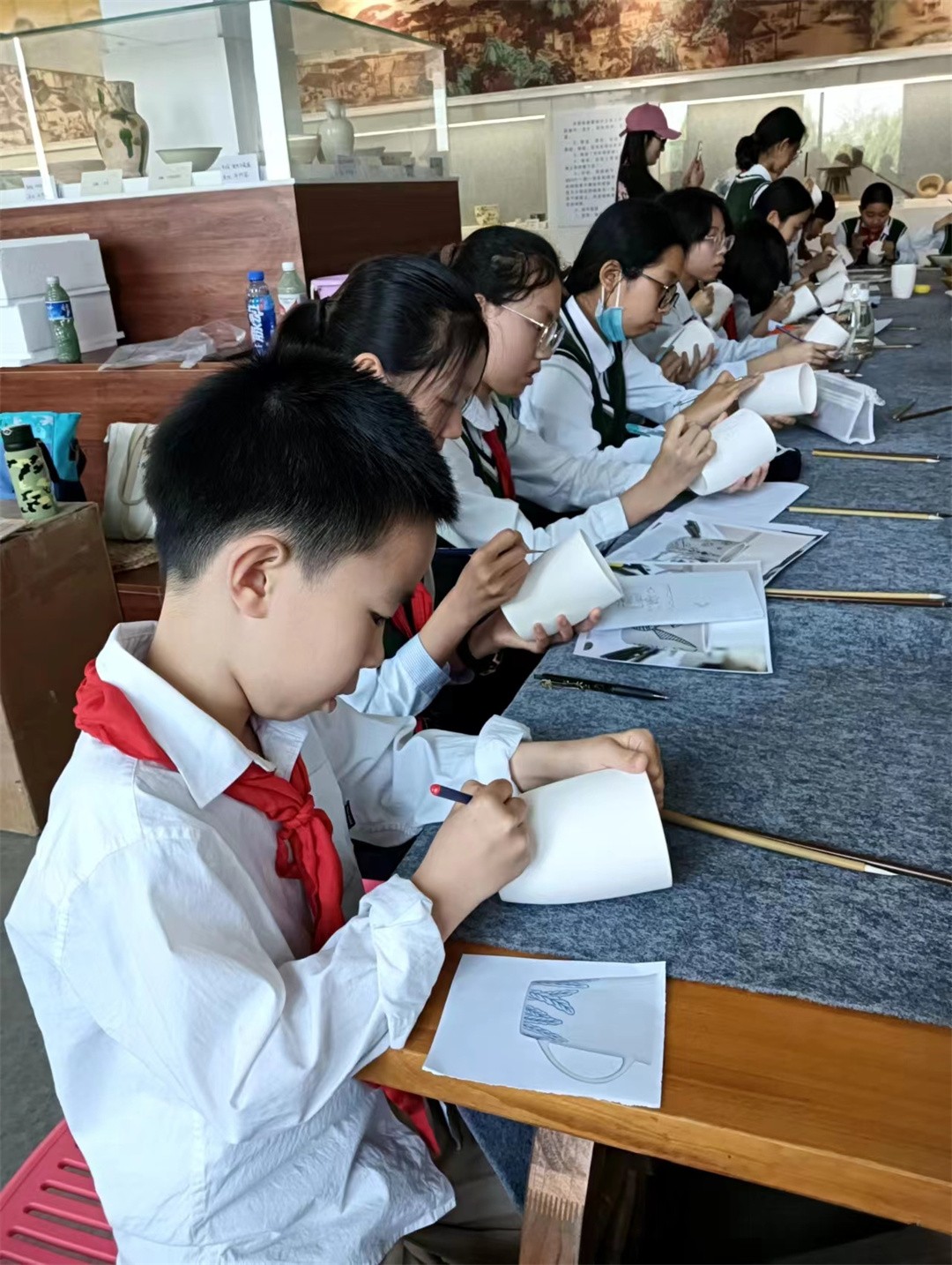在活動開始之前,同學們先認真完成了陶藝王老師布置的前參作業,對井陘窯資料收集、學習,帶著問題和思考去活動。在井陘窯工作人員的帶領和全程指導下,同學們聽講座+參觀+親自動手體驗學習、結合在學校陶藝課上所學的知識,同學們對陶瓷藝術更加著迷,多方位一體,深度研學,通過實物標本,同學們看到古代制瓷工匠,在選料、淘練、拉坯、修坯、配釉、施釉、裝飾、匣缽、燒裝、狀態和燒成等,可以清晰得看見瓷器燒造的全流程。同學們在參觀中學,在動手中領悟,零距離感受手藝人的匠心。在動手體驗實踐環節,同學們興致勃勃,沉浸式體驗釉下彩繪和拉坯陶藝技法,惟妙惟肖、栩栩如生的一個個作品在同學們手中誕生了,