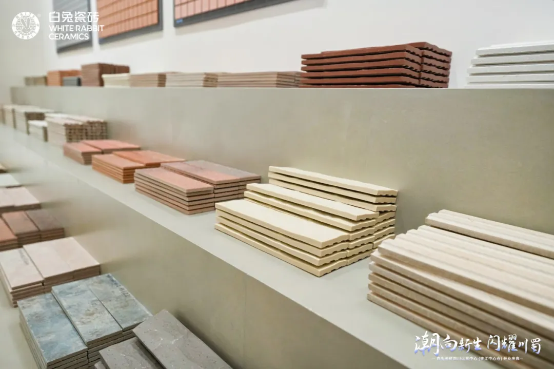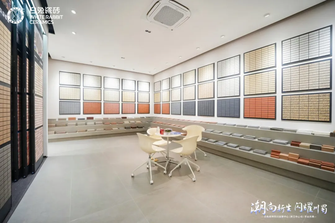 白兔瓷磚四川運營中心(夾江中心倉)展廳內(nèi)新品琳瑯滿目,以臻品墻地磚、藝術(shù)馬賽克、別墅外墻磚/精工外墻磚、小地磚“三磚融和 四磚并驅(qū) 五磚齊發(fā)”的產(chǎn)品品類矩陣,從單品的品質(zhì)細節(jié),到空間多元應用,從室內(nèi)室外,到墻上地面,打造一站式選材新體驗,一應俱全的產(chǎn)品可滿足多元化的消費需求,構(gòu)建美好的空間想象。