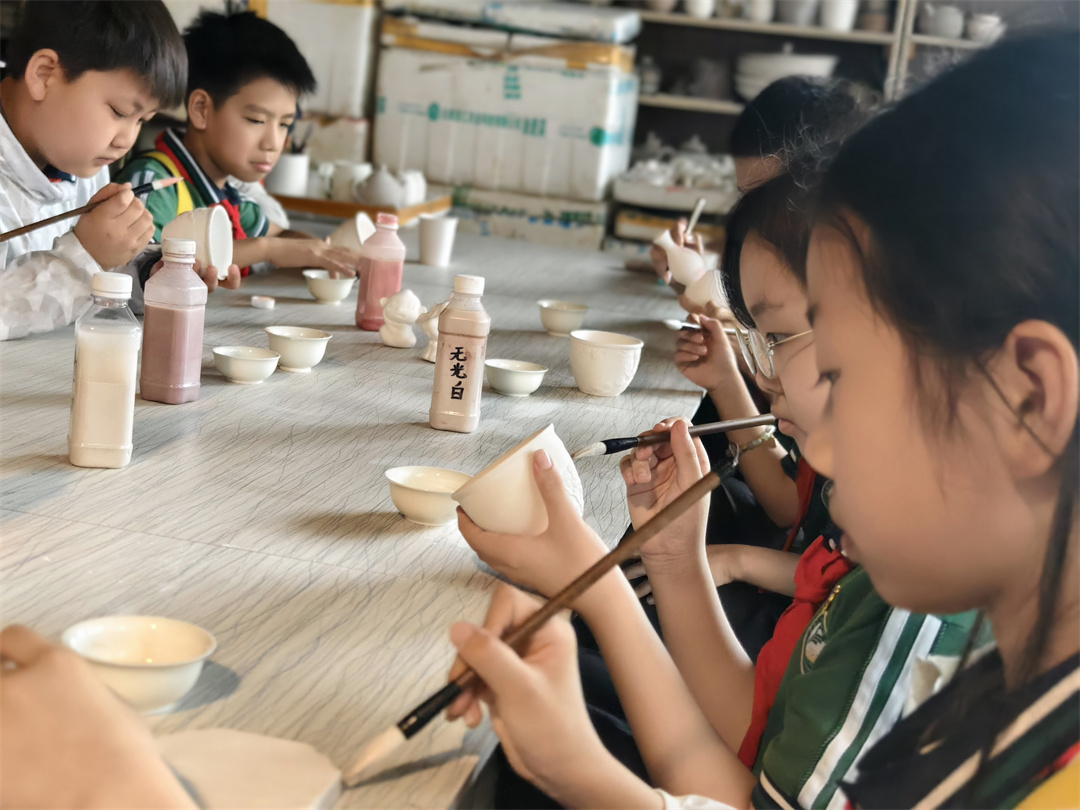 上午,盛世長安小學(xué)的師生、家長來到定窯的發(fā)源地――河北曲陽。在“自興定窯工作室”,定窯工藝美術(shù)大師王自興發(fā)表了熱情洋溢的講話,他首先向全體師生、家長送上最真摯的節(jié)日祝福。接著,王老師講解定窯歷史、定瓷原料、成型、裝飾、燒成工藝,隨后,觀看定窯老師拉坯演示,讓同學(xué)們大開眼界。在王老師指導(dǎo)下,詳細講解了陶瓷裝飾手繪的基本技巧和注意事項,同學(xué)們親自動手,沉浸式體驗,與定窯白瓷親密接觸,在素坯上揮灑創(chuàng)意,將靈感融入其中,創(chuàng)作屬于自己的獨一無二的作品,同學(xué)們不僅學(xué)到了陶瓷工藝技巧,更深刻體會到傳統(tǒng)手藝的匠心精神,感受傳統(tǒng)文化和非遺技法的魅力。