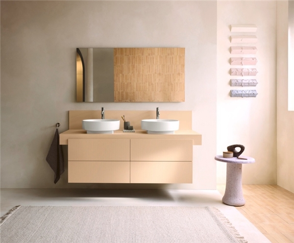 Patricia Urquiola的Balcoon系列作為2025年的全新系列,以時尚而純粹的設計語言,詮釋雙人生活的和諧之美。其標志性的雙人臺上盆線條簡潔流暢,集成式后板巧妙融入緊湊型臺面,成為洗漱區的視覺焦點。Balcoon系列不僅提供充足的實用空間,更以其獨特的設計維度,為浴室營造出溫馨而現代的氛圍,讓每一次互動都充滿默契與溫暖。